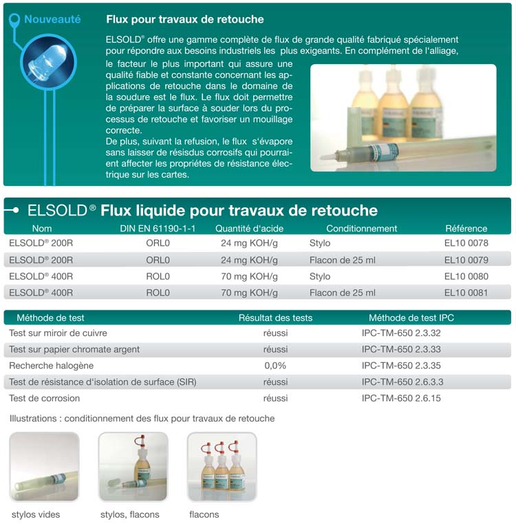 - Flux Elsold - Flux pâteux - Flux liquide ( retouche) - Flux pâteux(retouche) - Flux pour application voltaïque