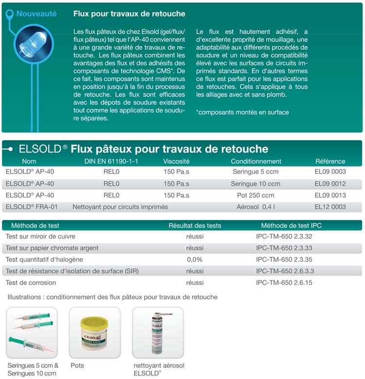 - Flux Elsold - Flux pâteux - Flux liquide (retouche) - Flux pâteux (retouche) - Flux pour application voltaïque